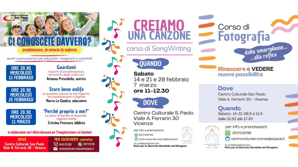 I prossimi appuntamenti Gli ultimi articoli: La Cappella di San Rocco dei Celestini 2 settimane ago Categorie: Appuntamenti“Creiamo una canzone” – Corso di Songwriting 2 settimane ago Categorie: Appuntamenti, VicenzaCorso Fotografia 2025 2 settimane ago Categorie: Appuntamenti, Vicenza“Ci conoscete davvero?” – Percorso per educatori 2 settimane ago Categorie: Appuntamenti, Vicenza Eventi coordinati dal Centro Culturale San Paolo