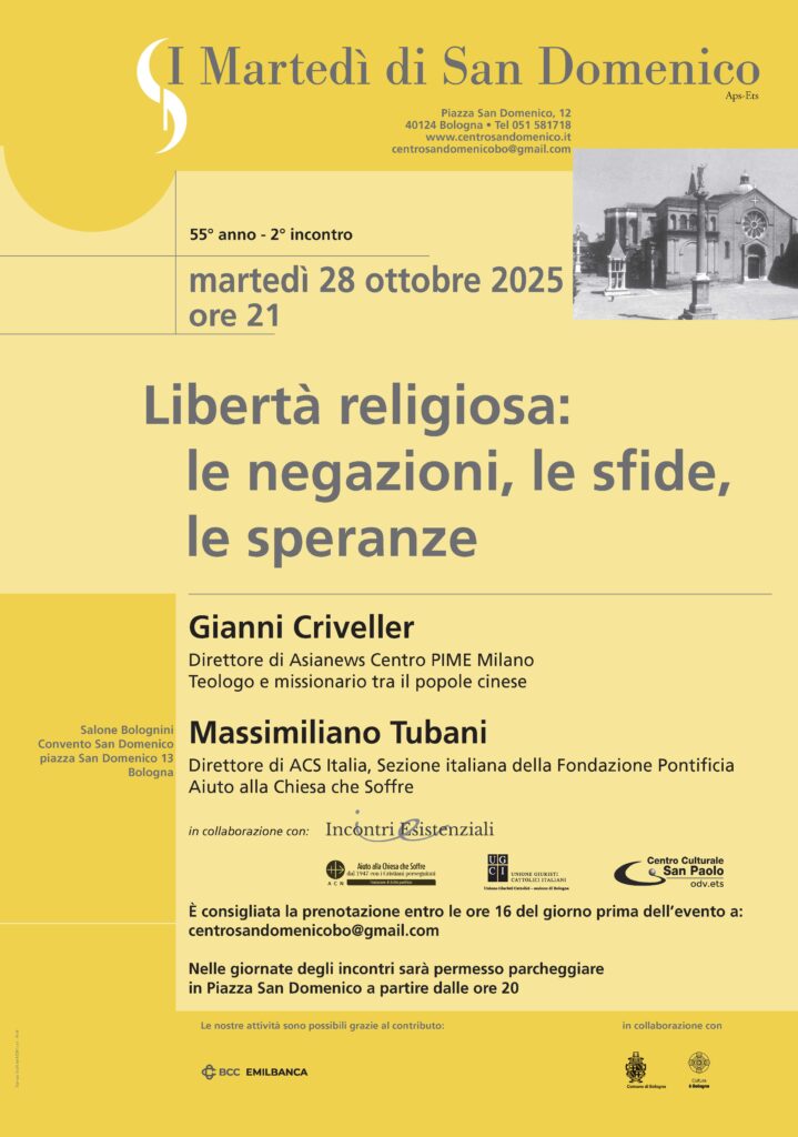 La libertà religiosa non è solo un diritto scritto nelle costituzioni o proclamato nelle carte internazionali: è la misura della dignità di una società, la cartina di tornasole della sua umanità. Su questo tema – urgente, complesso e troppo spesso dimenticato – il Centro San Domenico di Bologna dedica il secondo incontro del ciclo “I Martedì di San Domenico”, giunto alla sua 55ª edizione, martedì 28 ottobre 2025 alle ore 21, nel Salone Bolognini del Convento di San Domenico.