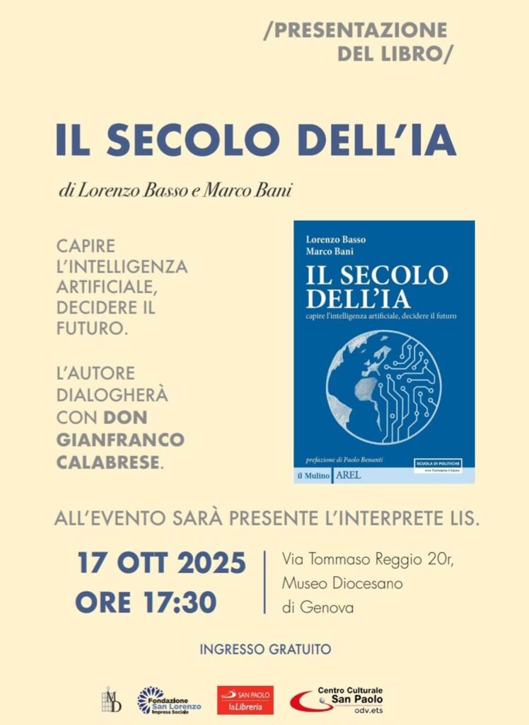 Venerdì 17 ottobre 2025, alle ore 17:30, il Museo Diocesano di Genova ospiterà la presentazione del libro “Il secolo dell’IA. Capire l’intelligenza artificiale, decidere il futuro”, scritto da Lorenzo Basso e Marco Bani, edito da il Mulino in collaborazione con AREL.