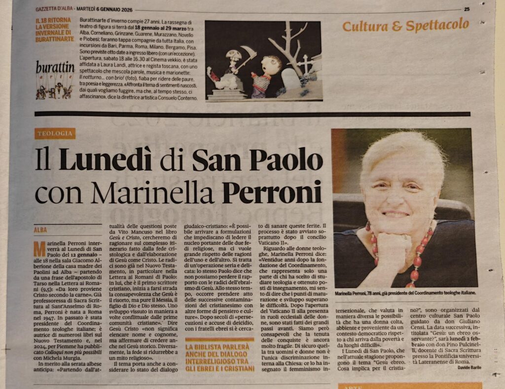In occasione dell’incontro, è inoltre da segnalare l’intervista che il settimanale diocesano Gazzetta d’Alba le ha dedicato proprio oggi: un contributo prezioso, per il quale vanno i ringraziamenti al direttore don Truglia e al giornalista Davide Barile.