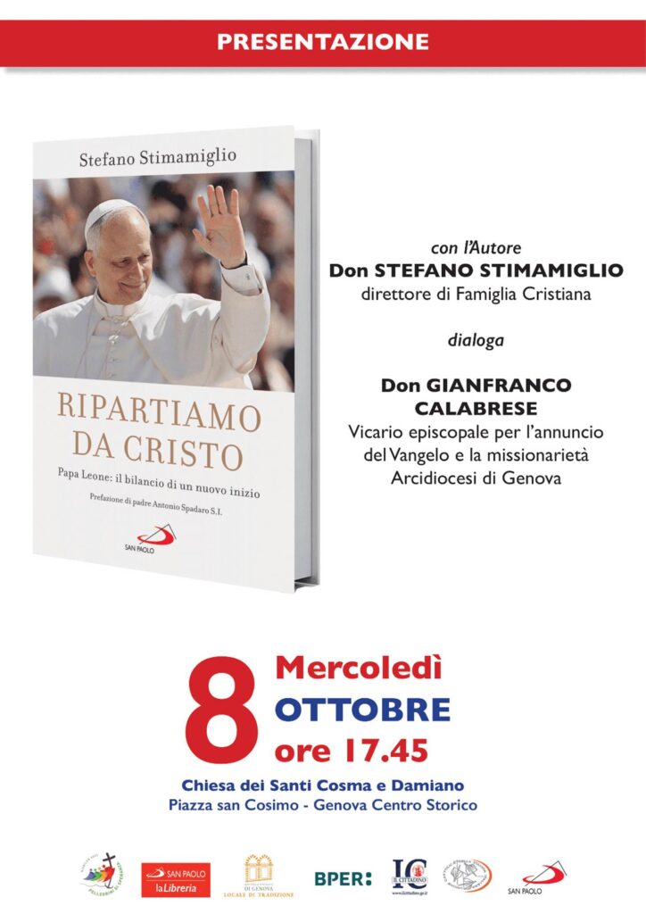 Mercoledì 8 ottobre alle ore 17.45 presso la Chiesa dei santi Cosma e Damiano, piazza San Cosimo – Genova Centro Storico, si terrà la presentazione del libro “RIPARTIRE DA CRISTO – Papa Leone: il bilancio di un nuovo inizio” – Edizioni San Paolo con l’Autore Don STEFANO STIMAMIGLIO – direttore di Famiglia Cristiana. Dialoga Don GIANFRANCO CALABRESE – Vicario episcopale per l’annuncio del Vangelo e la missionarietà Arcidiocesi di Genova.