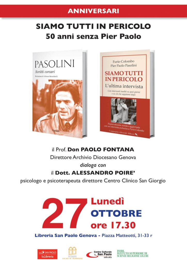 Lunedì 27 ottobre alle ore 17.30 presso la Libreria San Paolo, Piazza Matteotti 31-33 r – Genova verrà ricordato PIER PAOLO PASOLINI a 50 anni dalla sua morte con l’iniziativa “SIAMO TUTTI IN PERICOLO. 50 anni senza Pier Paolo“